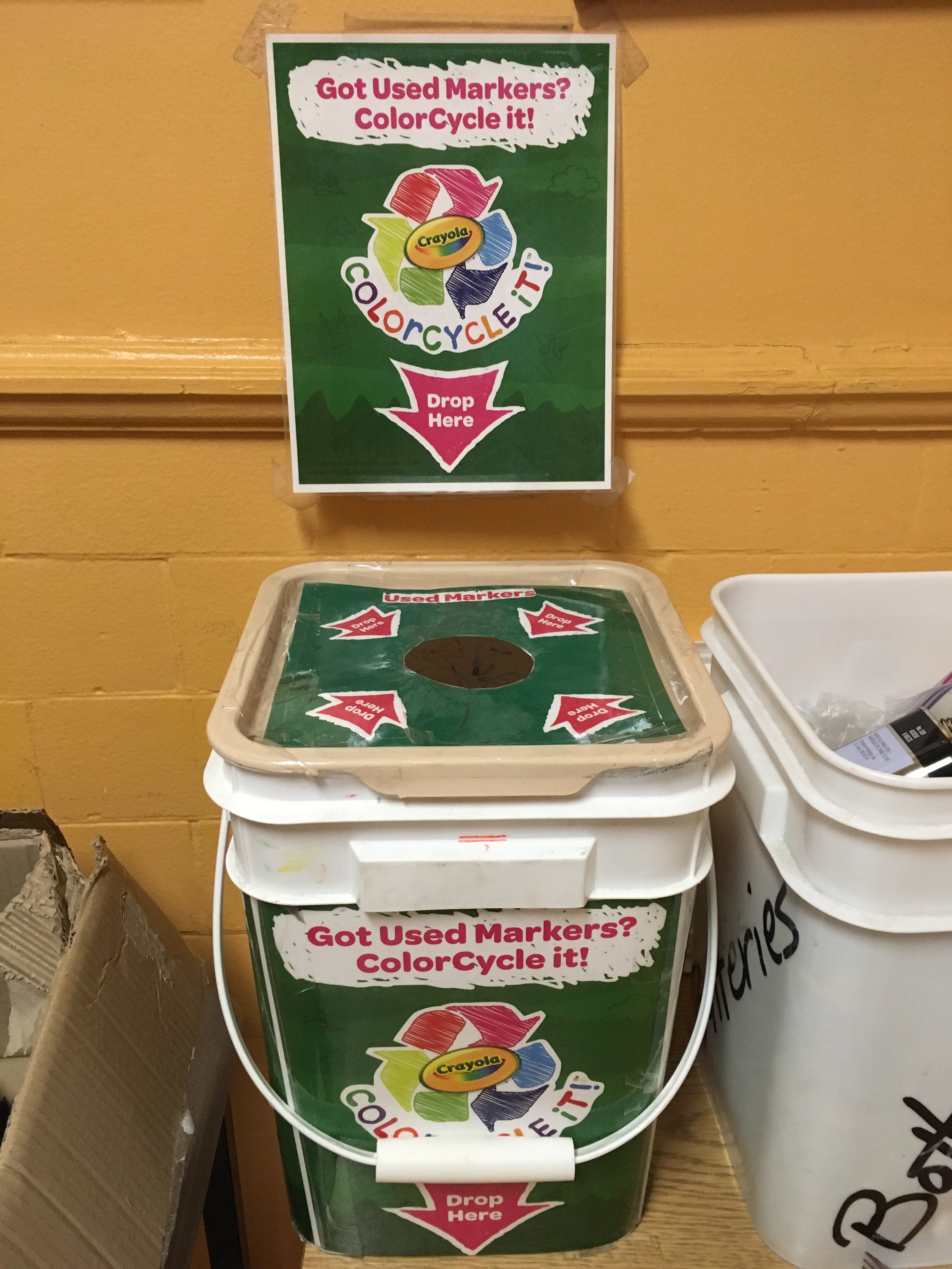 Look for this collection container in the main hallway beside the lost and found. Markers are collected and shipped to Crayola for recycling as part of their ColorCycle program. Their program accept all brands of markers (how awesome is that?).