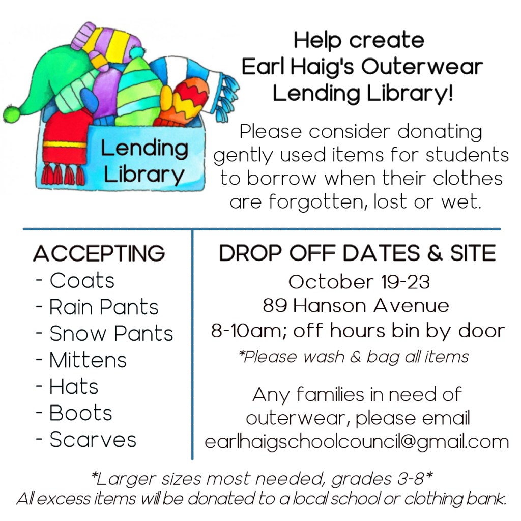 For any families that would like to make use of our (free!) Outerwear Lending Library, please email us or contact Acting Principal Upeslacis or Vice Principal Landry.