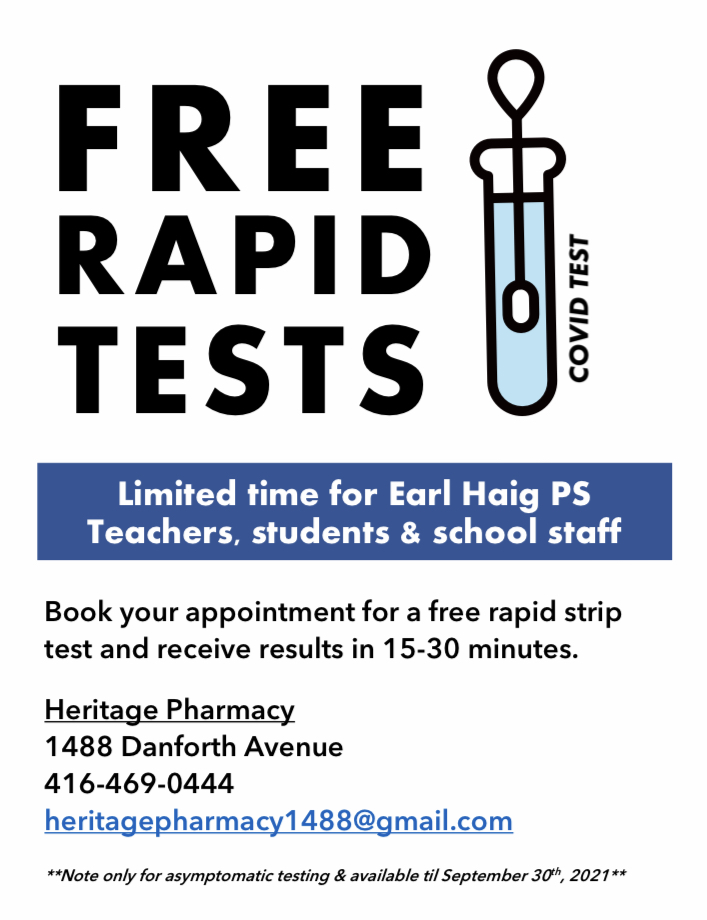 A parent in our school community has coordinated a limited time offer of FREE rapid testing for Earl Haig PS students, teachers, and staff at a local pharmacy (Heritage Pharmacy, 1488 Danforth Ave). **The free testing is only for asymptomatic individuals and is only available until September 30th, 2021.
