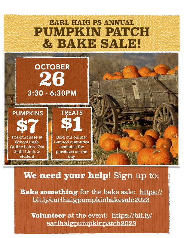 Bake something tasty for the bake sale: https://bit.ly/earlhaigpumpkinbakesale2023 or volunteer at the event: https://bit.ly/earlhaigpumpkinpatch2023