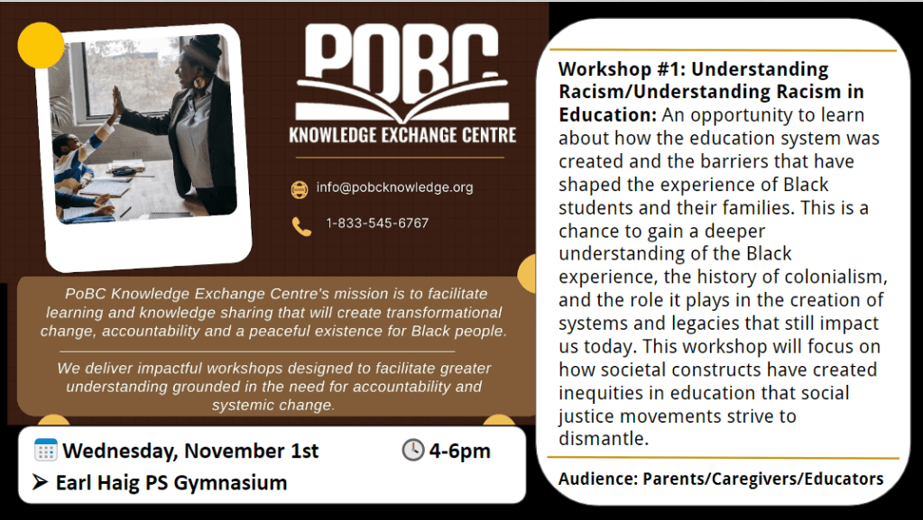 Earl Haig PS is excited to offer a workshop on Racism in Education presented by Parents of Black Children Knowledge Exchange Centre. The workshop will be held on Wednesday, November 1st from 4:00 – 6:00 PM in the Earl Haig gymnasium and parents/caregivers are invited to join our staff for this important learning.