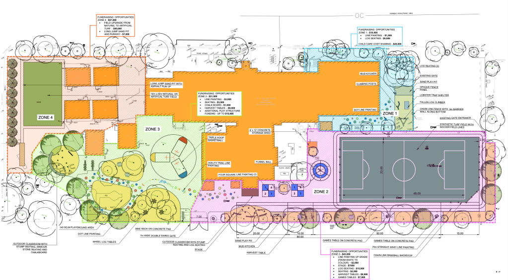 - We are fundraising for an additional field, outdoor classroom, seating throughout yard, updated play structures, stage area and seating, harvest tables, games tables, agility trail painting in colour, etc.